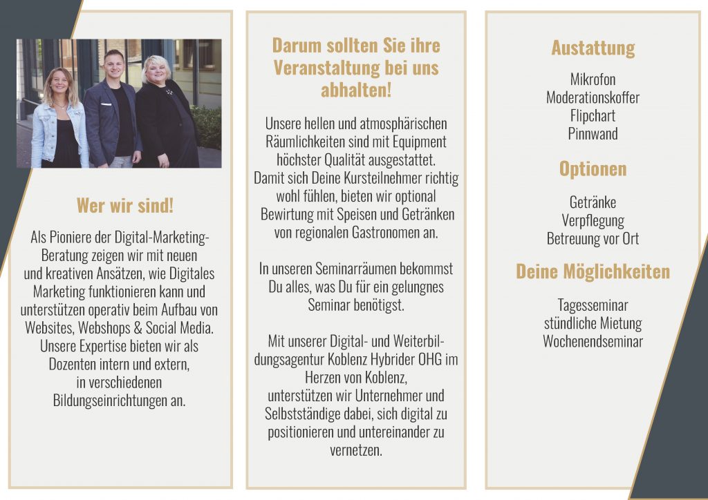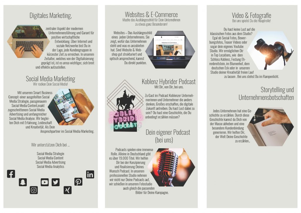 Für das Start-up Hybrider habe ich die Gestaltung von drei thematisch unterschiedlichen Flyern übernommen, die zur Präsentation auf der RheinMosel Messe eingesetzt wurden.